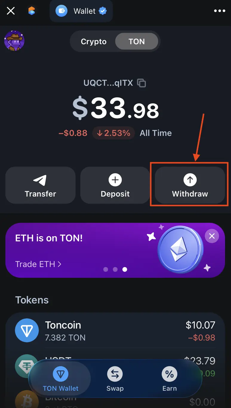 Click the withdraw button inside the @wallet app